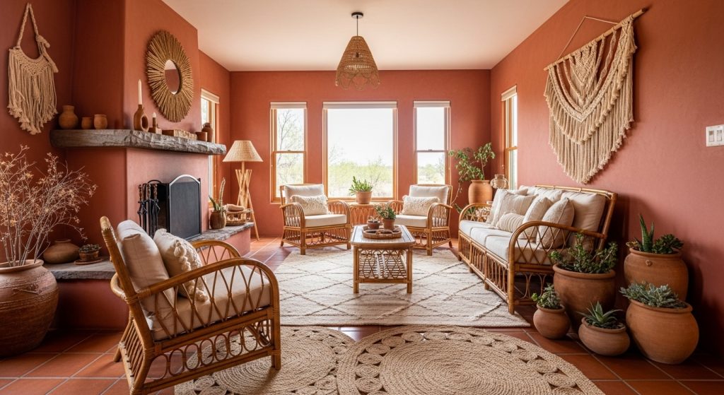 It pairs exceptionally well with rattan furniture, woven textures, and natural fibers, making it ideal for rustic, Southwestern, or boho living rooms. Terracotta also works beautifully alongside greens and creams for a harmonious color palette. For more ideas on how to style terracotta, browse these living room decoration inspirations.