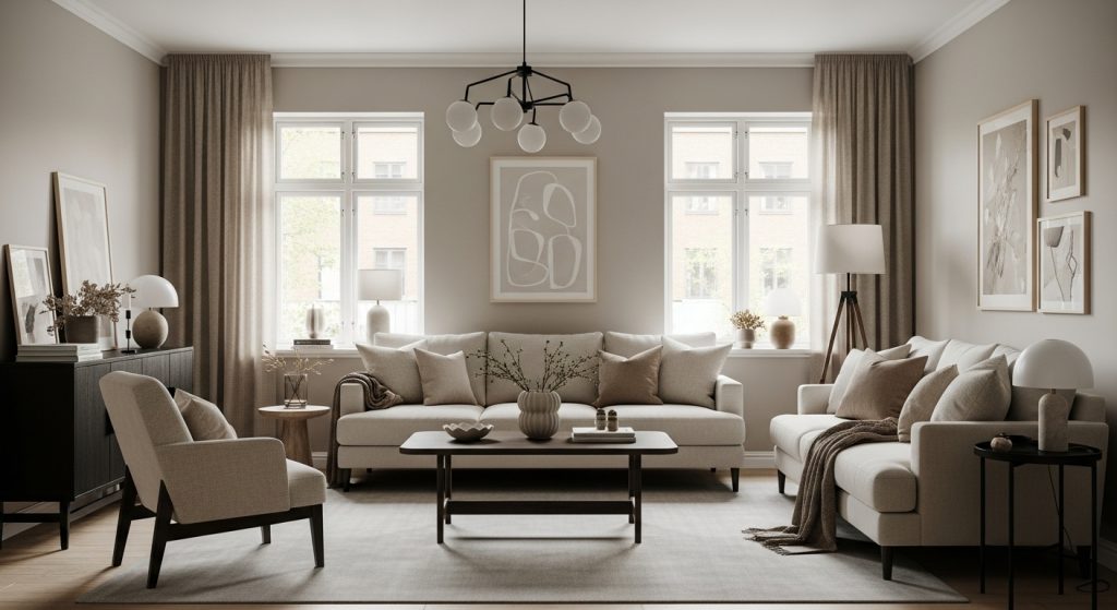 Greige pairs beautifully with both warm and cool accent colors, letting you play around with seasonal decor and trends. It’s especially suitable if you’re after a cohesive, serene, and refined living room. Explore more ideas to style greige with interior design living room inspirations.