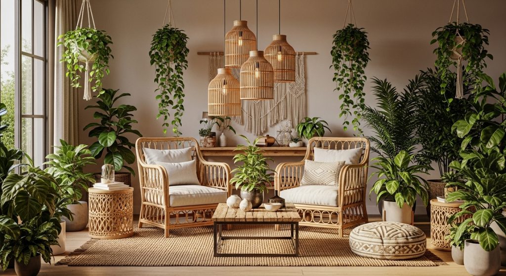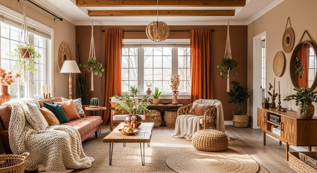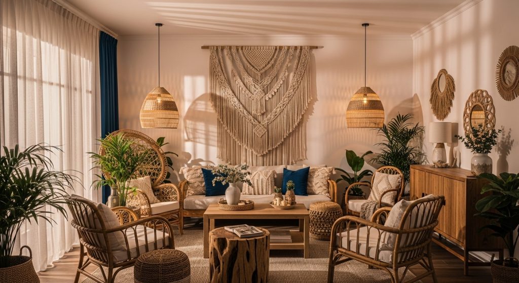 Boho living room decor thrives on nature-inspired materials. Incorporate rattan chairs, cane furniture, bamboo light fixtures, and jute rugs to ground the style with organic textures. Wood is a must — from reclaimed wood coffee tables to carved wooden mirrors, it brings a sense of earthy authenticity.