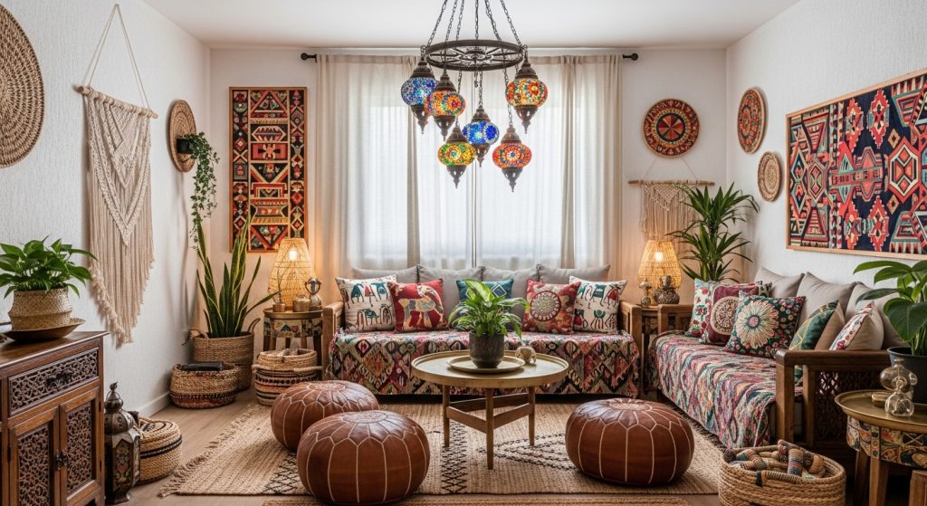 Boho style celebrates a global, traveled feel. Incorporate decor pieces that draw from different cultures: Moroccan poufs, Indian block-printed pillows, Turkish lanterns, or West African mud cloth. These accents lend authenticity and a storytelling aspect to your boho living room.