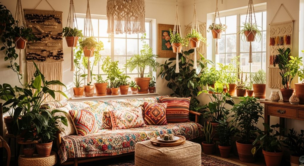 Try displaying them in woven baskets, terracotta pots, or macrame plant hangers for that quintessential bohemian feel. If you have a small space, vertical plant stands or hanging planters can save floor space while still bringing in nature, just like the ideas from small living room ideas.