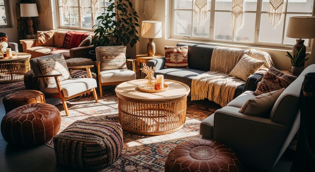 The boho style is meant for relaxing and gathering. Instead of rigid seating, create cozy conversation zones. Floor cushions, poufs, and a mix of sofas and armchairs will make your space feel flexible and casual.