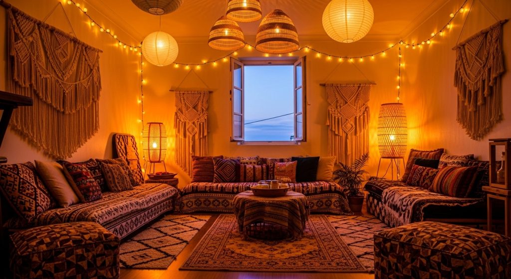 The right lighting can make or break your boho living room. Think layered lighting — string lights, paper lanterns, woven pendants, and vintage-inspired lamps. Use warm-toned bulbs to create a relaxing, intimate mood.