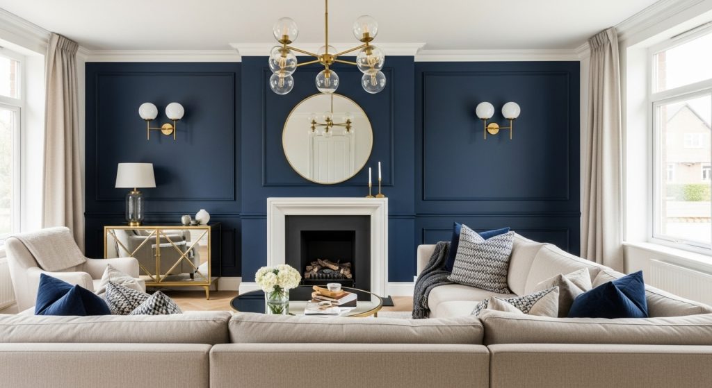 Pair navy with lighter neutrals, like white or cream, for contrast and balance. Metallic elements such as gold or brass can add a touch of luxury and sophistication to a navy-themed room.