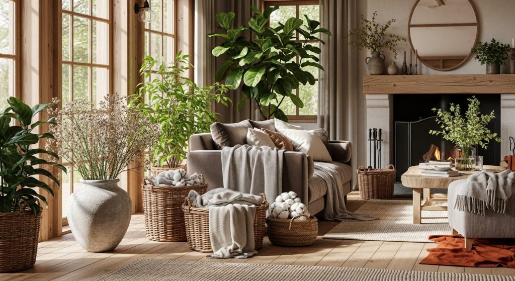 Nature-inspired elements instantly infuse a sense of serenity and calm. Consider adding rustic wooden coffee tables, stone vases, clay planters, or wicker storage baskets. Houseplants, of course, are a wonderful way to bring the outdoors inside, improving both the air quality and the cozy aesthetic.