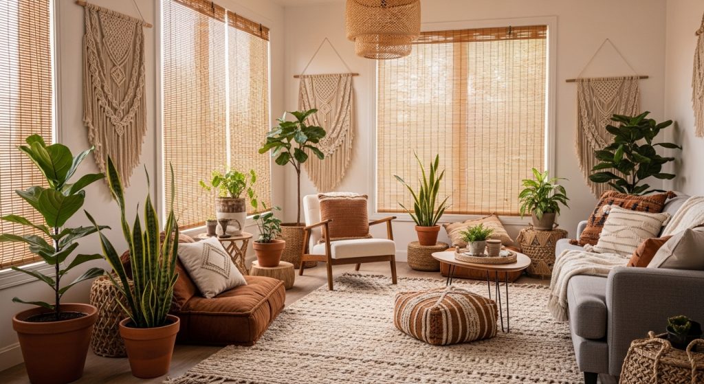 Want a more sustainable choice that looks great too? Bamboo blinds bring nature indoors, adding texture and a laid-back, organic feel to your space. They’re perfect for those embracing a boho living room decor style or earthy color palettes.