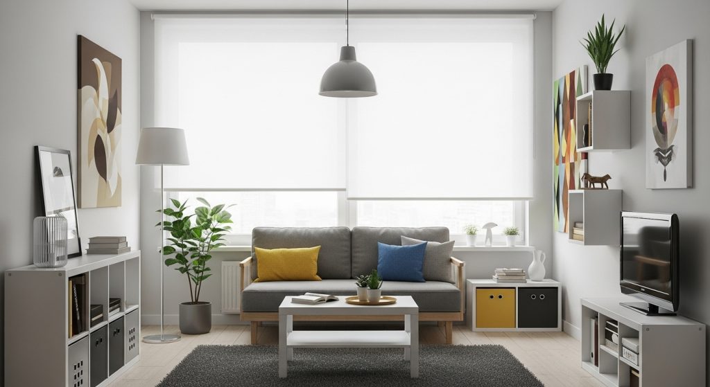 Roller blinds are a go-to solution for those seeking simplicity, affordability, and functionality. They roll up neatly, making them an ideal option for small living room designs, especially in apartments where space is limited.