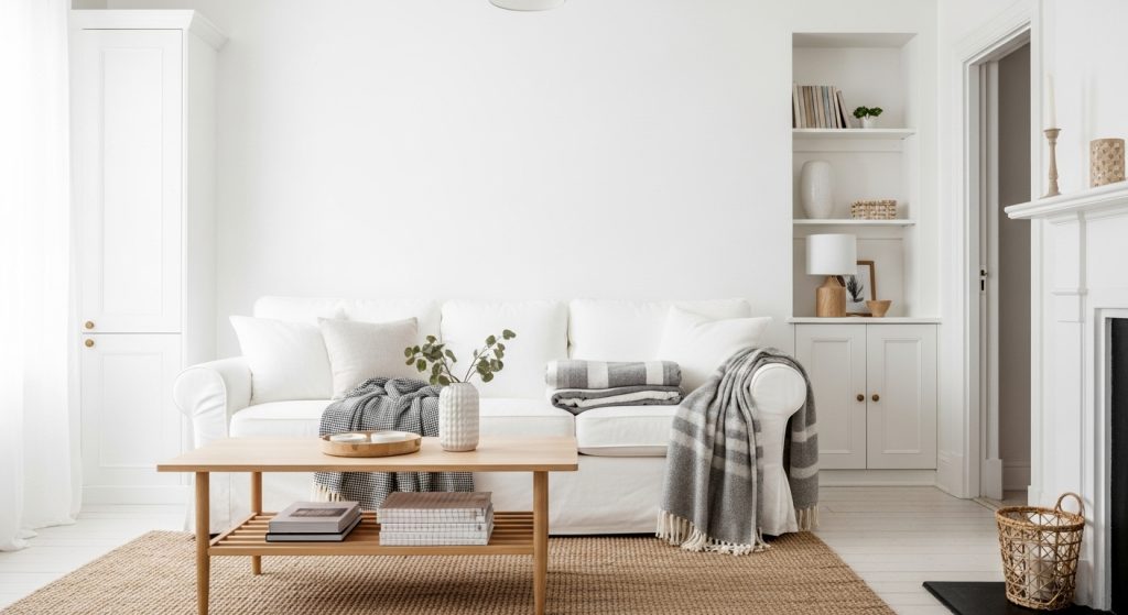 White living rooms will never go out of style. They feel crisp, fresh, and endlessly adaptable. Whether you prefer a modern, minimalist, farmhouse, or coastal vibe, white walls can be the perfect blank canvas. Layer in textures—like wool throws, linen pillows, and woven baskets—to keep the space feeling cozy and not sterile.