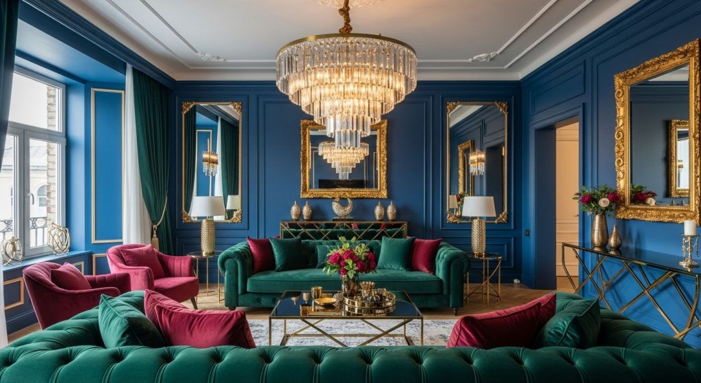 Emerald green, sapphire blue, amethyst purple, and ruby red bring drama and richness to your living room. These deep, saturated colors create a luxurious vibe that feels sophisticated and glamorous. Jewel tones work best when balanced with neutral furnishings or metallic accents to prevent them from overwhelming the space.