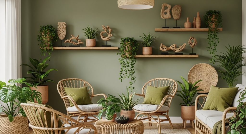 Earthy green living room color schemes are on trend for good reason. Olive, sage, and forest green connect your interior to the outdoors, creating a refreshing, organic feel. Greens pair beautifully with natural textures like rattan, stone, and jute, helping you achieve a harmonious environment.