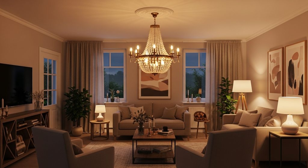 Lighting can make or break a room’s atmosphere. Use a combination of overhead lights, floor lamps, and accent lighting to create a warm, inviting environment. For example, pair recessed ceiling lights with a dramatic chandelier and add table lamps for reading. Layered lighting brings both functionality and elegance, making your living room glow at every hour.