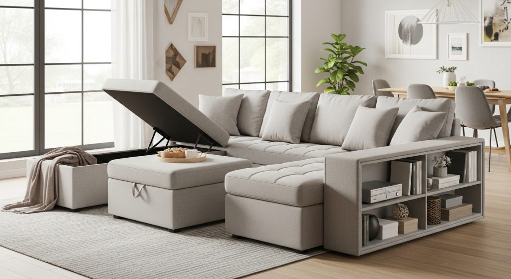 For those living in smaller spaces, multifunctional furniture is a game-changer. Ottomans with hidden storage, foldable tables, or sectional sofas with built-in shelves help maximize your space without compromising style. For additional small space solutions, visit these small living room ideas.
