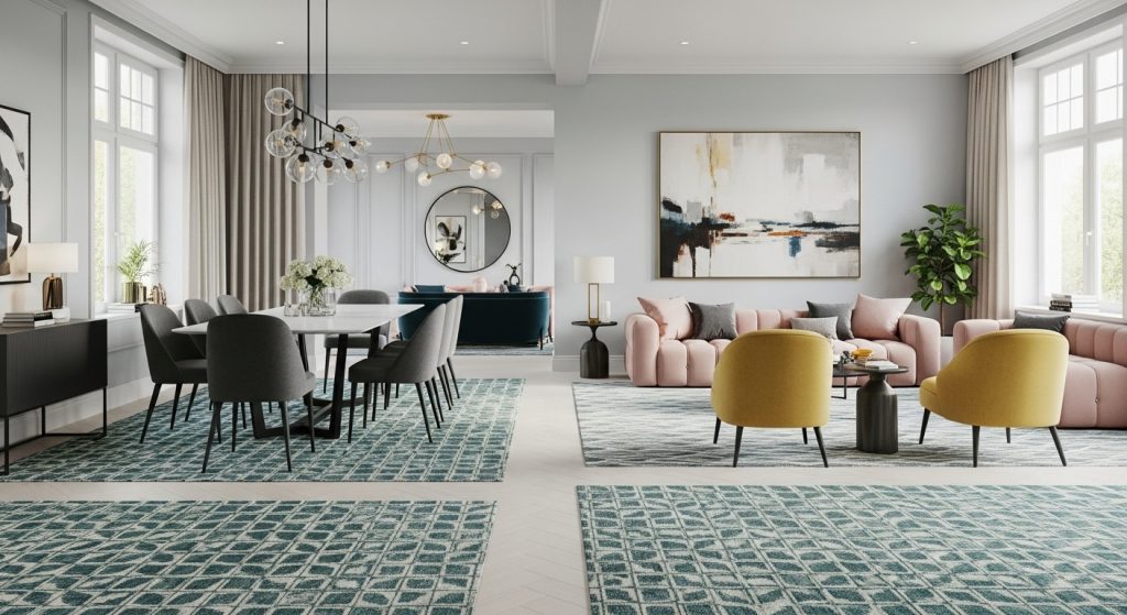 If you have an open-plan living area, area rugs are a practical and stylish way to define different zones within the same space. For example, you can place a rug under your seating area to separate it from a dining corner. This technique also helps add color and pattern to your living room, complementing other living room decoration ideas.