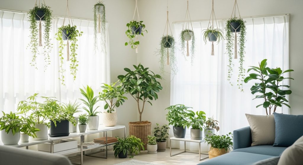 Bringing greenery into your living room is a timeless interior design strategy. Plants not only purify the air but also add a calming and organic touch to your space. Consider large potted plants, like a fiddle-leaf fig, or a collection of smaller succulents for your shelves. If you’re working with limited floor space, these small living room decor ideas can help you style plants creatively.