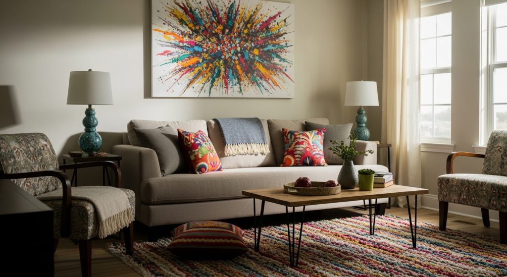 Finally, don’t be shy about color. Whether you love soft neutrals or vibrant jewel tones, choose a palette that makes you happy. Accent pillows, rugs, and wall art are great places to add pops of color. For more insights into balancing tones and patterns, have a look at these interior design living room resources.