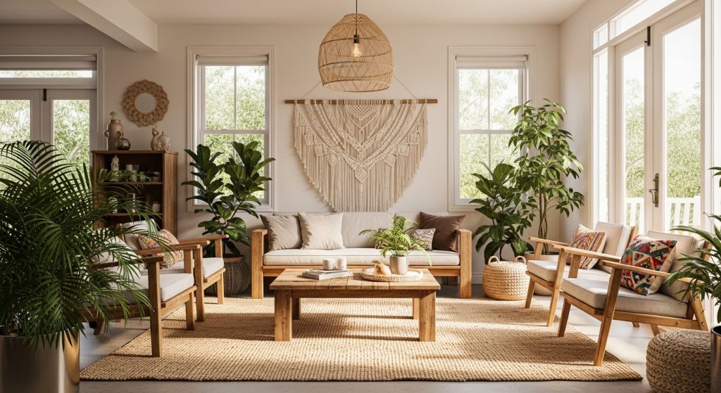 Nature-inspired interiors never go out of style. Wooden coffee tables, jute rugs, and potted plants help soften a modern room and create a tranquil vibe. If you’re a fan of earthy, cozy spaces, the boho living room style could be a perfect match.