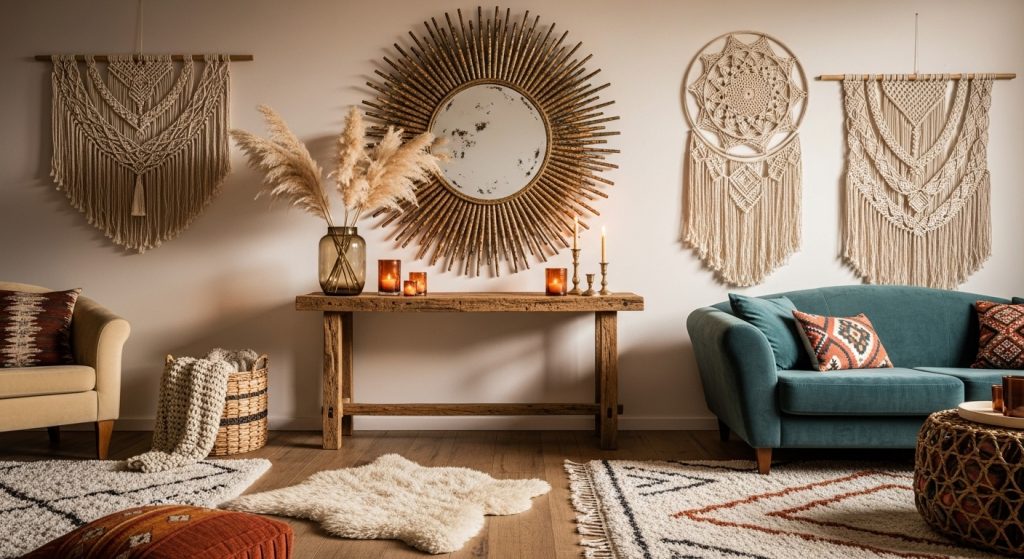 Add warmth and texture using fabric wall hangings, woven art, or macramé. These pieces are great for boho or nature-inspired spaces.