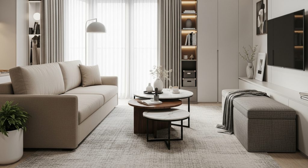 One of the smartest modern small living room ideas is choosing multi-functional furniture. Think sleeper sofas for guests, nesting coffee tables, or ottomans with hidden storage. These clever pieces save space and add practicality without sacrificing style.