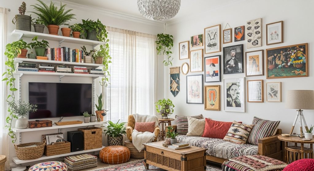 Think beyond the floor plan and utilize your walls. Tall bookshelves, wall-mounted cabinets, and hanging planters help free up valuable floor space while adding style and storage. A gallery wall can also draw the eye upward, giving the impression of a higher ceiling.