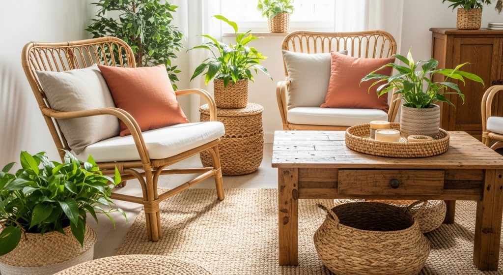 Natural textures like wood, jute, linen, and greenery can soften the sometimes-sterile feel of a compact living room. A few potted plants, a woven basket, or a reclaimed wood coffee table add warmth and connect your space to the outdoors.