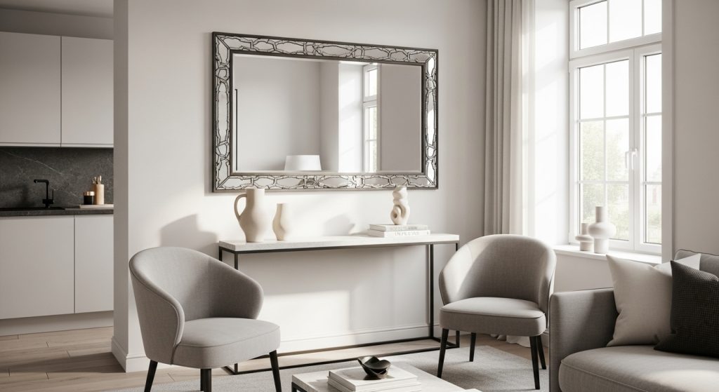 Mirrors are a tried-and-true trick for making a small room appear larger. Place a large mirror across from a window to bounce natural light around the room. Decorative mirror walls or mirrored furniture can also bring a modern edge while enhancing the feeling of spaciousness.