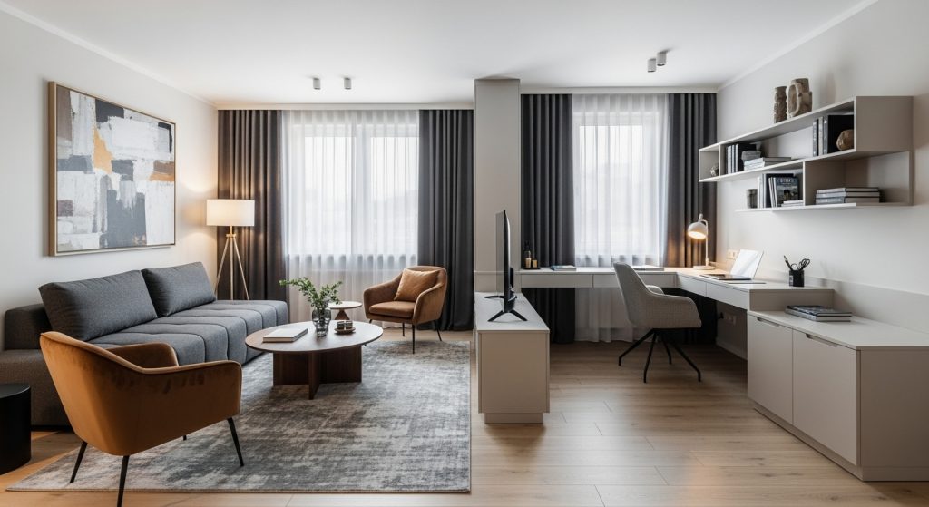 Open-concept living areas, especially in smaller apartments, can benefit from clearly defined zones. Use rugs, lighting, or furniture arrangements to separate lounging, dining, or work areas without the need for walls.
