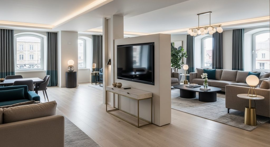 In a multifunctional small living room, flexibility is key. A swivel TV mount lets you adjust the screen depending on where you’re sitting — whether you’re on the couch, dining table, or even working from a nearby desk. This eliminates the need to angle furniture awkwardly.