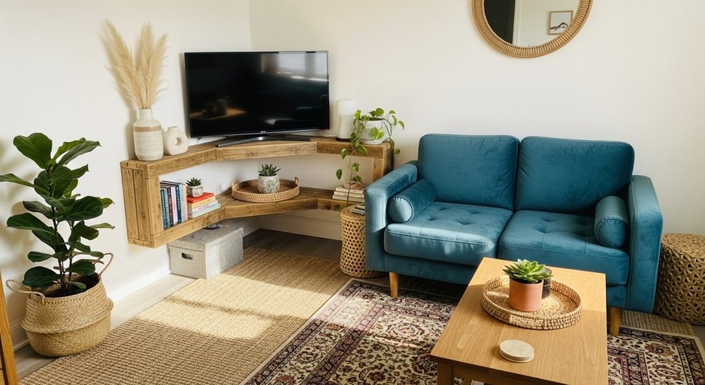 In particularly tight layouts, corner TV placement can be a game-changer. It opens up the central area of the room and allows more flexible seating arrangements. Use a triangular TV stand or a floating shelf designed for corners.