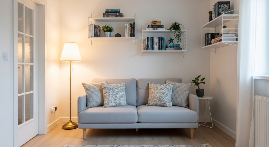 Tip: Pair it with wall-mounted shelves for better use of vertical space. Explore more small living room ideas to complement your loveseat.