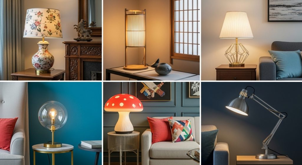 For lovers of vintage glamour, art deco lamps with bold geometric shapes and brass accents offer a timeless appeal. Complement them with living room wall decor ideas that include mirrors and abstract prints.